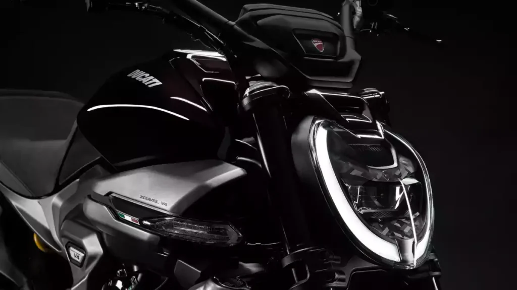 Design-wise, the XDiavel V4 sticks to its “power cruiser” DNA but adds a sharper, more futuristic touch. The exposed trellis frame, wide handlebar, low-slung seat, and stretched wheelbase scream boldness. The V4 engine with quad exhaust tips adds a menacing look, making this bike stand out even among premium machines.