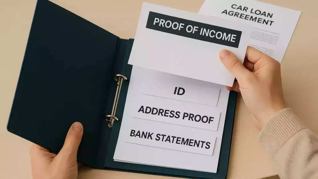 You typically need identity and address proof, income proof, and the car dealer’s quotation to apply.